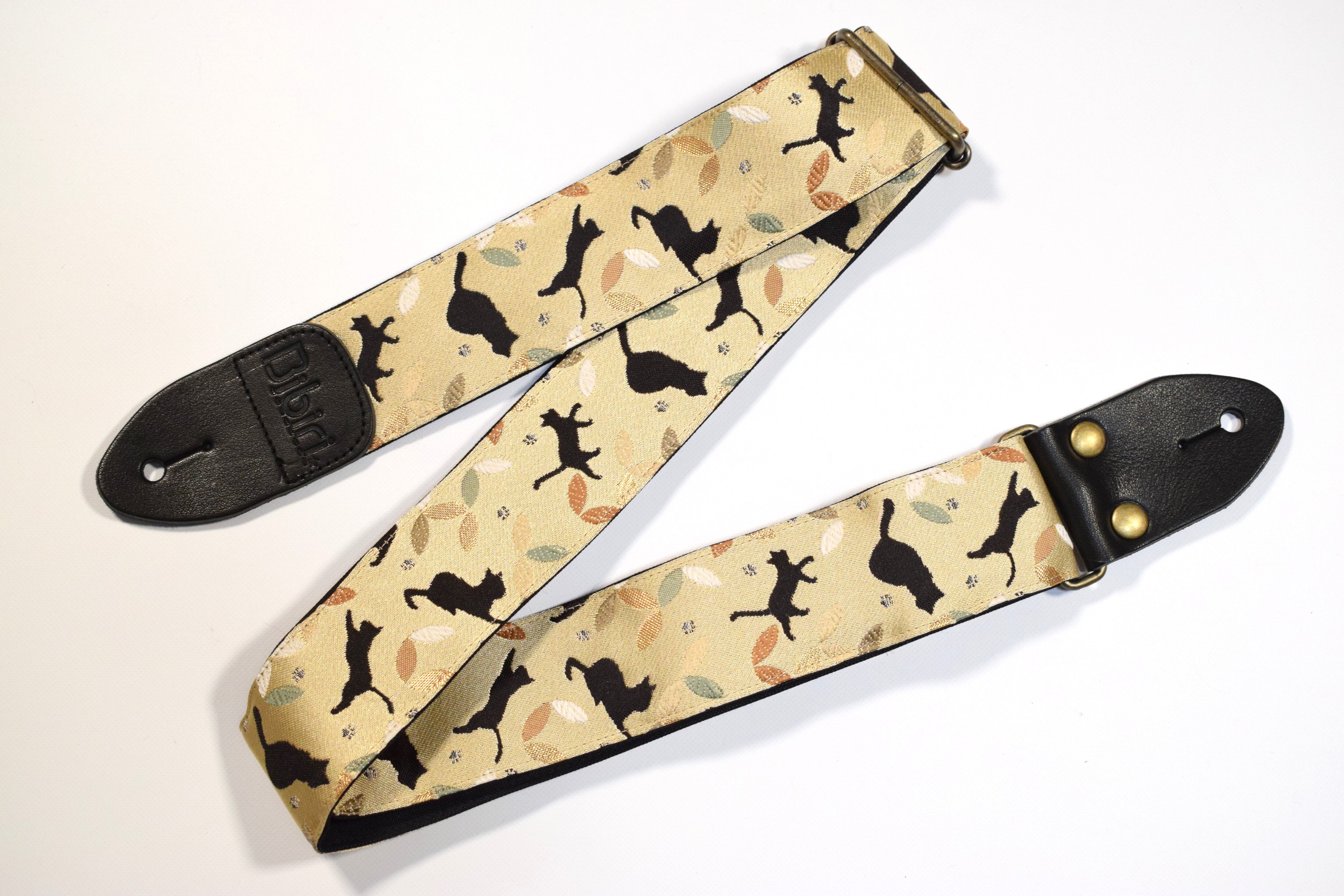 猫と七宝 帆布ギターストラップ(ベージュ)京都金襴
