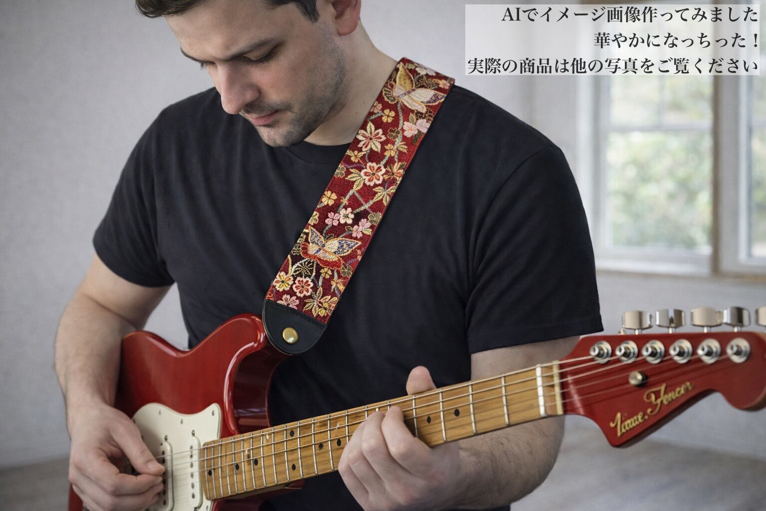 蝶と霞 帆布ギターストラップ(赤)京都金襴